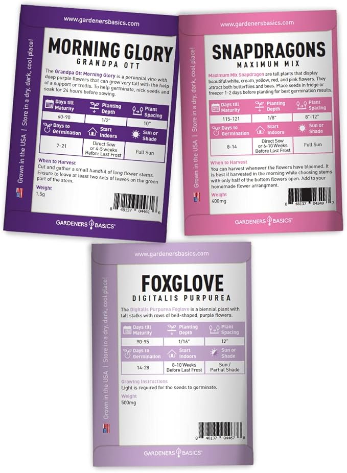 - VARIETIES - The 5 varieties included in this assortment are; Snapdragons, Morning Glory, Lupine, Foxglove, and Zinnia wildflower seeds for planting!