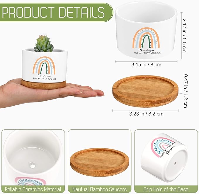 - Value Pack: you are provided with 6 pieces of succulent pots with bamboo tray designed in 6 different boho rainbow patterns and inspirational thank you phrases, with ample quantity and rich styles, you can hand them out as gifts to express your deep appreciation and sincere wishes to your teachers, thanking them for their help and efforts