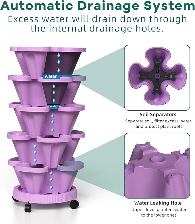 - Flow Design - The water filtration system from top to bottom can save water and retain moisture but prevents overwatering or root rot. 5 filters are placed on each level to keep the soil from going through the big drainage holes, it also helps retain water in each planter level.