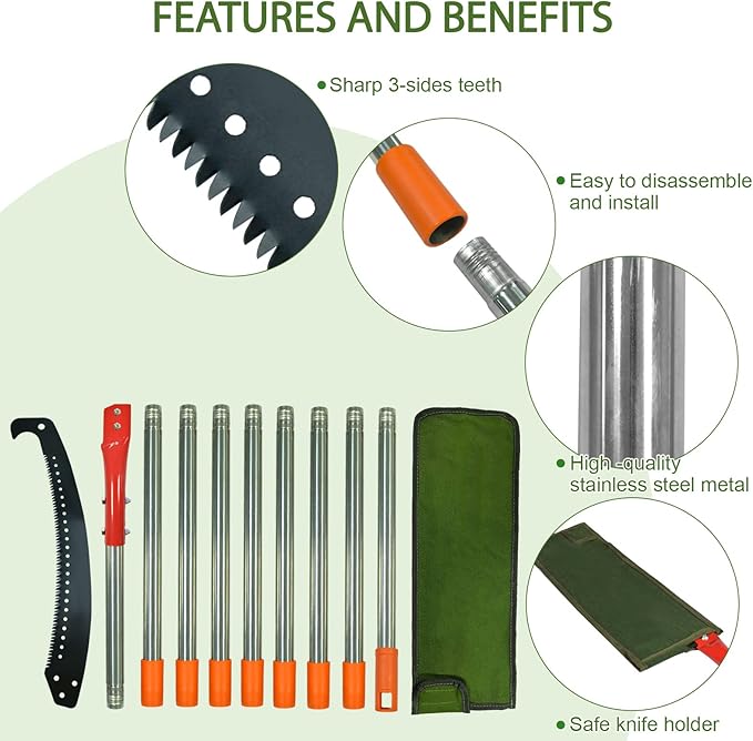 - WIDELY USED AND MULTIPURPOSE: The tree saw with pole can be used for pruning trees at lawn, yard, patio, garden, forestry or other places that needs to trim the branches and leaves. No power required, no batteries required, and no complicated preparations, with adjustable poles and one saw blade, you can start pruning work anytime and anywhere