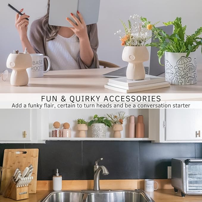- Mushroom Planter with whimsical etched design all around. Fun and quirky decoration sure to make a cottagecore statement. Holds small indoor plants, fresh flowers, and succulents