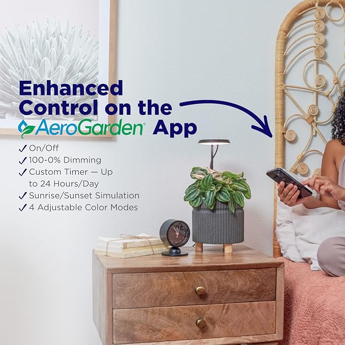 - Easily customize your smart grow light via the AeroGarden app, with features including custom light schedule, dimming capabilities, sunrise/sunset setting, and four adjustable Light Modes