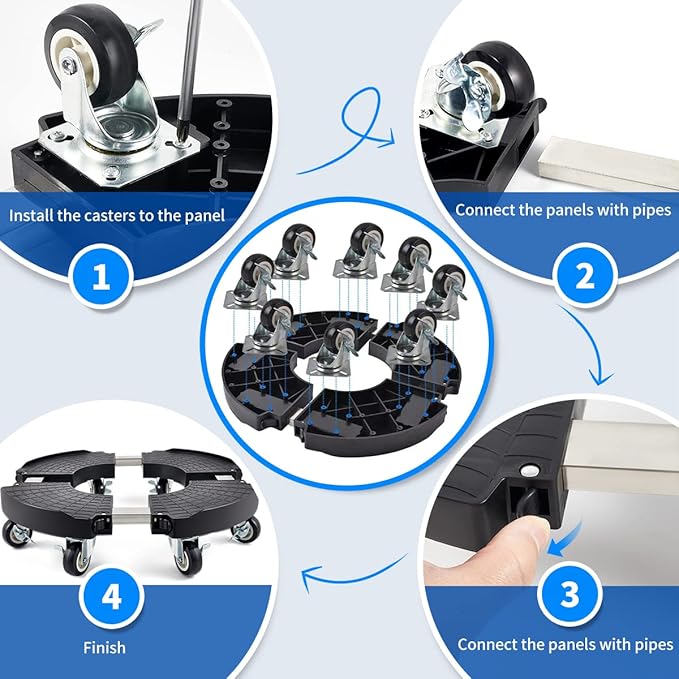 - Plant stand with wheels heavy duty package includes 8 casters, 4 panels, 4 connecting pipes, a screwdriver and some screws. Follow the installation instructions in the product details to install the casters, connect the panels, and fix the buckles, and the plant caddy can be assembled quickly