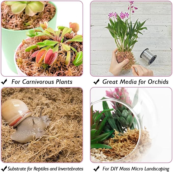 - Great Media For: Our dry plant moss are comfortable growth environment for carnivorous plants because of their water retention. They are also a good substrate for reptiles. They can provide a bit of humidity and a material for invertebrates to burrow in and also helps with shedding. And it also can be used as transportation packaging materials for some plants and living aquatic animals.