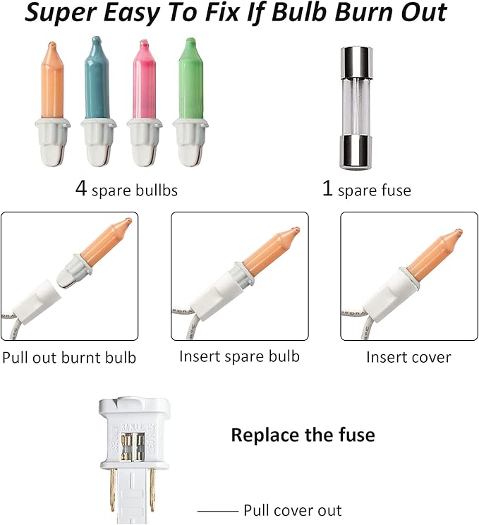- High Quality: Build-in 3A fuse and pass with UL certified, is safety for both indoor and outdoor decorations. Each bulb works individual, others will work well when one bulb is defective. Just use the spare bulbs to replace the defective bulb.