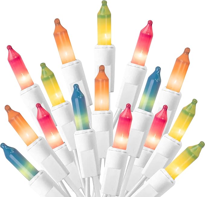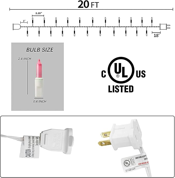 - Light Specifications: With 100 incandescent lights, the lighted length of the lights is 18.5 ft, the leading wire is 1.5 ft, and the bulb space is 2.25 inch. Work voltage of each bulb is 2.5V / 0.42W, safety with built in 3A fuse. Package include: 1 x 20 ft mini string light, 1 x spare fuse, 4 x spare incandescent bulbs.