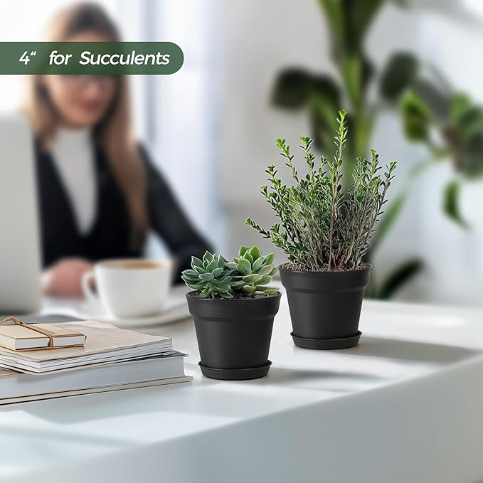 - | Excellent Drainage System | - Multiple mesh drainage holes at the bottom of these 4 inch plant pots make excellent air and water flow, which can protect the health of roots and avoid drowning. Super air permeability and water drainage can prolong the life of your carefully cultivated plants. Also, the saucers can help hold the excess water.