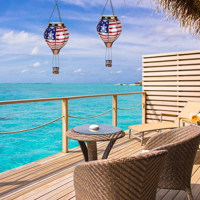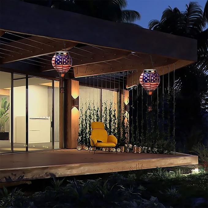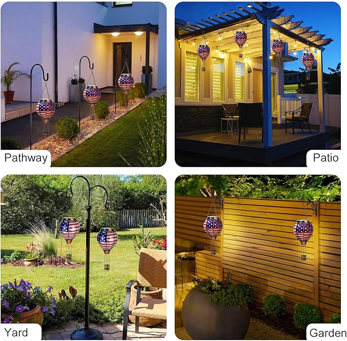 - 【Unique Hot Air Balloon Design】--This hanging solar light is composed of 8 pieces of flag glass with lifelike flame lights. As night falls, their glow adds warmth and comfort to your garden, patio, yard, path, and more: July 4th Independence Day decoration, great Christmas decorative lights.
