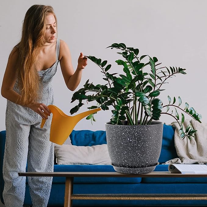 WOUSIWER Plant Pots 10/9/8 inch, Set of 3 Modern Decorative Plastic Planters with Drainage Holes and Saucers for House Plants Indoor Flowers Plants, Black with White Speckles