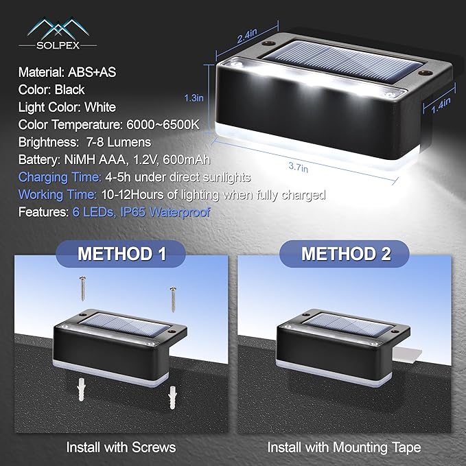 - 【IP65 Waterproof & Long working time】The deck lights solar powered are designed with IP65 waterproof. With the upgraded solar panel and rechargeable battery, the solar step lights for outside can illuminate up to 15 hours after fully charged for 4-6 hours with direct sunlight