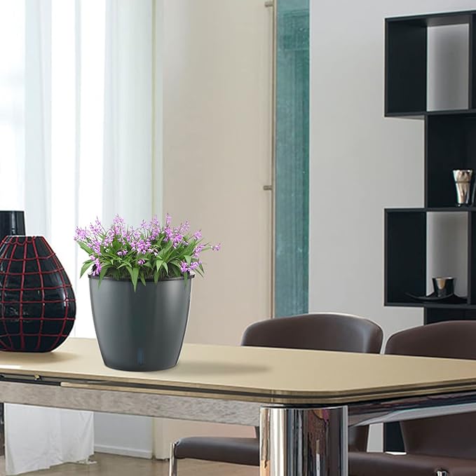 - Easy to Use: This self watering planter are designed with a double-layer system for convenience: Black Inner Pot and Outer Pot with water-level indicator. The wick inside the inner pot draws water from the reservoir to the roots, ensuring your plants get consistent hydration without the risk of soggy soil. It’s the ultimate hands-off solution for healthy plants!