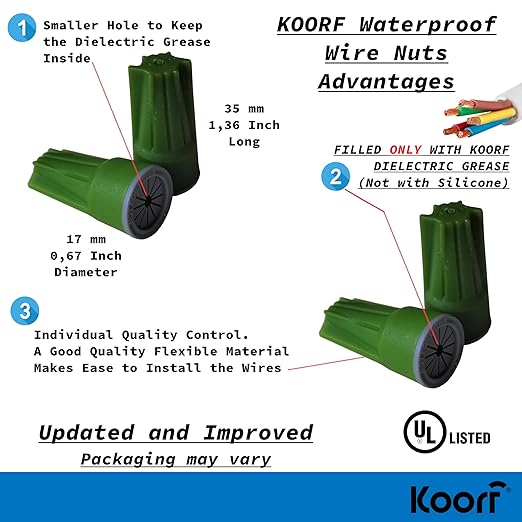 - ✔ AMERICAN OWNED AND OPERATED SMALL COMPANY: U-V resistant waterproof wire nuts that can withstand a 600-volt surge, for connections exposed to condensation, water, vapors, or dust, for use in outdoor lighting, outdoor wire and cable connectors to avoid short circuits in any exposed wiring. ✔ Efficiency: UL LISTED FOR Copper to Copper connections only. PREMIUM wire nuts for any INDOOR & OUTDOOR application. Quick connect wire connectors. Wire connectors with Exclusive Features only from KOORF, your American Brand.