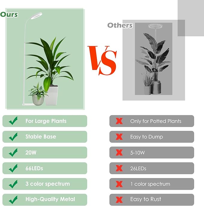 - 【2024 Upgrade Design for Tall Large Plants】The grow lights come with a sturdy base stand that is not top-heavy. It features a 3-segment removable aluminum alloy structure, which can be adjusted to 32/47/63 inches. The plant light is perfect for home gardening, flower shows, tall potted plants, and exceptionally large indoor plants. It can also serve as stylish decor for any home space.