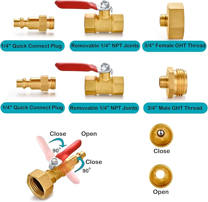 - EASY TO USE: Step one: screw the water pipe to the female thread side,connect the quick plug to the quick coupling inside the air compressor line, step 2: turn on the air compressor and rotate around the ball stem to open or close, step 2 adjust the air flow rate to blow dry water from the water pipe.