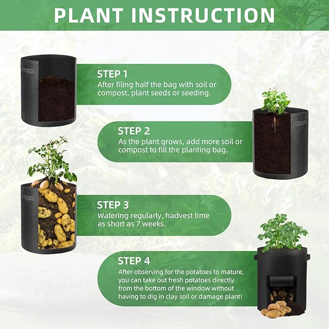 - 【Wide Application】The 10 Gallon potato growing bags can be used to grow potatoes, tomatoes, carrots, garlic, onions, beans, apple trees, papaya trees, guava trees, flowers, and so on. You can plant different plants according to your personal preferences. They can be folded and washable, and easy to clean for yearly reuse.