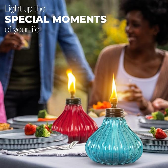- LIGHT UP WITH EASE: Our offered tabletop table torches feature thick glass, high quality fiberglass wicks, and snuffer caps. For best burn, fill the canister with fuel, insert the wick so it's no more than ½" above the canister, and allow it to saturate for 10-15 minutes. These tips will ensure that the wick will last the lifetime of your torch.
