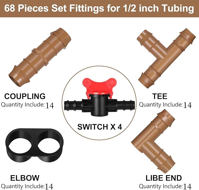 - Package Contains: this package includes 4 switch valves, 14 tees, 14 couplings, 14 elbows and 14 end cap plastic plugs; A total of 60 pieces to meet your long term needs; You can use the drip irrigation kit to building an efficient and practical drip irrigation system