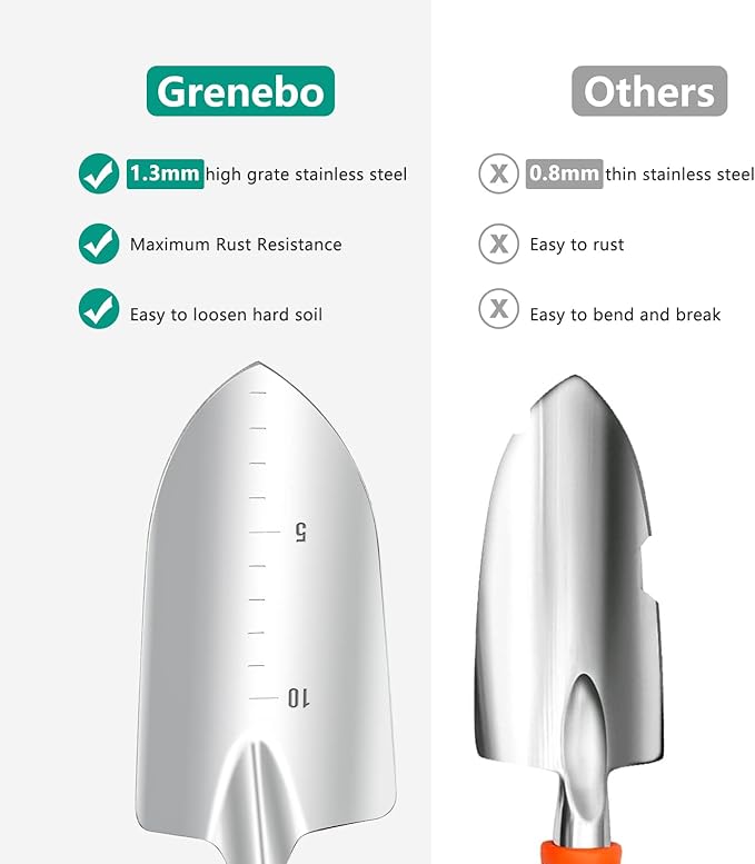 • Premium Product Quality: Made of high-strength SK-5 carbon steel, this stainless steel gardening tools is durable and rust-proof. Moreover, with high-performance material like this, these gardening tools are hardly deformed.