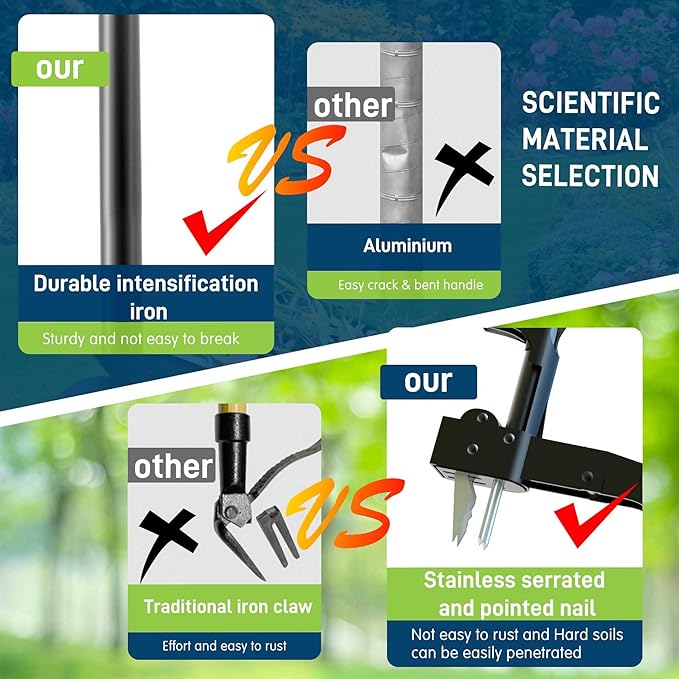 - 🌿【Upgraded 4-Claws Design】Our standing manual weeder is designed with 2 long stainless steel claws and 2 sharp serrated prongs, the 4 special claws will firmly grasp various weeds without breaking the roots, making it easier to remove weeds permanently no matter what kind of soil they grow on.