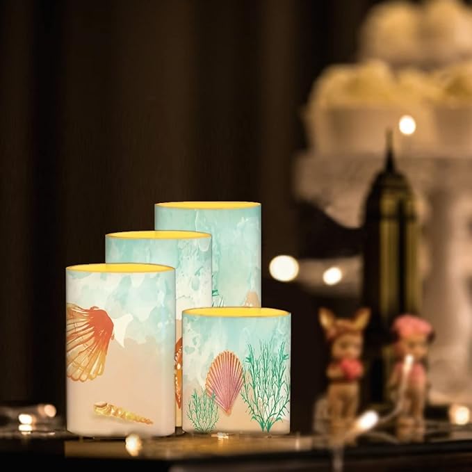 Beach Flameless Candles Battery Powered with Multicolor Timer Remote Control Everlasting Fake Candles for Coastal Marine Garden Indoor Outdoor Decor, Starfish Seashell Coral