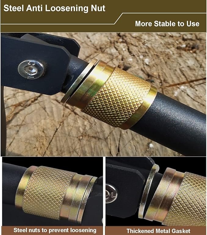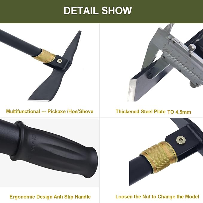 - 3 IN 1 SHOVEL PICK HOE TOOL: The heads of foldable shovel are versatile. It can be pickaxe, hoe or shovel. This makes it ideal for digging, shoveling, sawing, cutting and hammering. The design of the nut allows for conversion of picks, shovels and hoe
