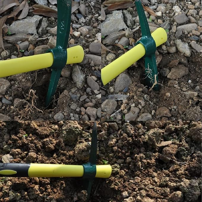 - NON-SLIP HANDLE -- The fiberglass handle of the pickaxe is lightweight and comfortable, while its non-slip rubber coating ensures a secure grip. Meanwhile, the hoe's shaft is designed for easy operation and reduced arm fatigue.