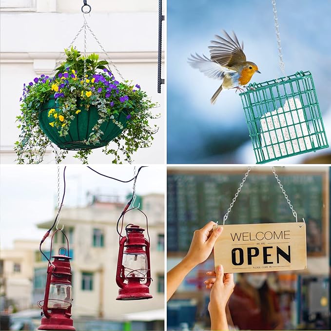 - Wide Application: Hanging basket chain with hooks endless uses. Decorate your outdoor and indoor, The silver chain hooks for hanging plants、bird feeders、bird houses、plant baskets、flower pots, lanterns、wind chimes、christmas lights、christmas hanging basket、stained glass、ceiling、shooting targets、isle markers etc. Tips:Each of our chains has 2pcs S hooks, which make the suspension stronger and safer.