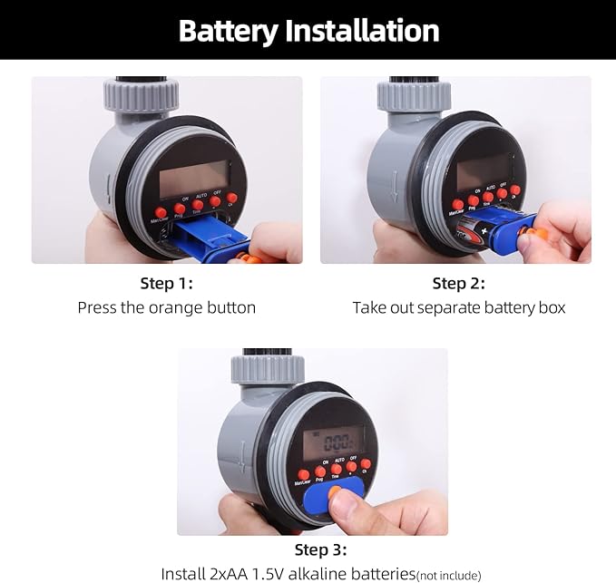 - Compared with traditional ball valve timers, this product has upgraded ball valve functions (better leakproof design), delay function (maximum water conservation) and battery function (larger capacity battery room design: only 2*1.5V AA can use alkaline battery - not included).