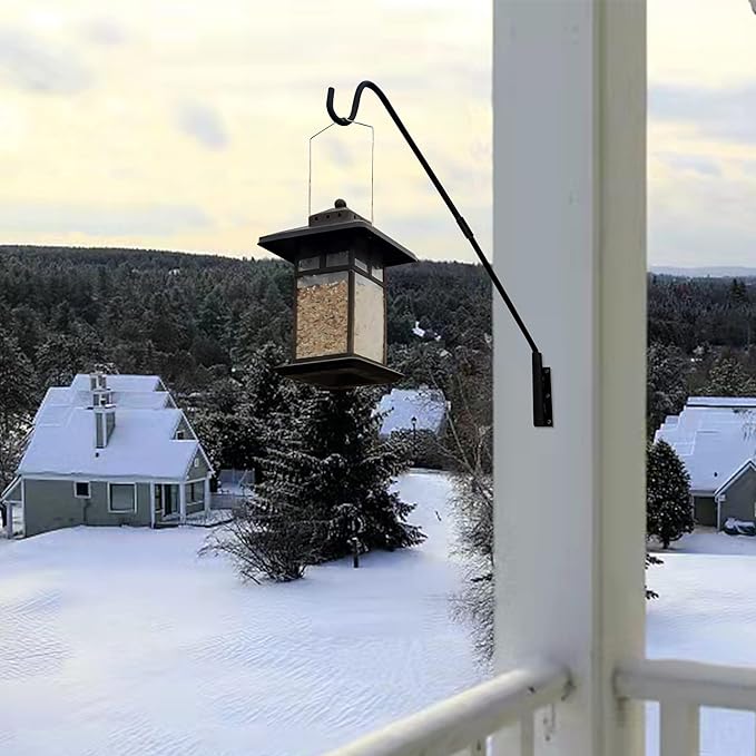 - Premium Quality - Our weather-proof powder-coated metal maintains its subtle black color and quality season after season. Solid bracket and curved shepherd hook helps securely hold items. Suggested max hanging weight: 11 lbs (5 kg)
