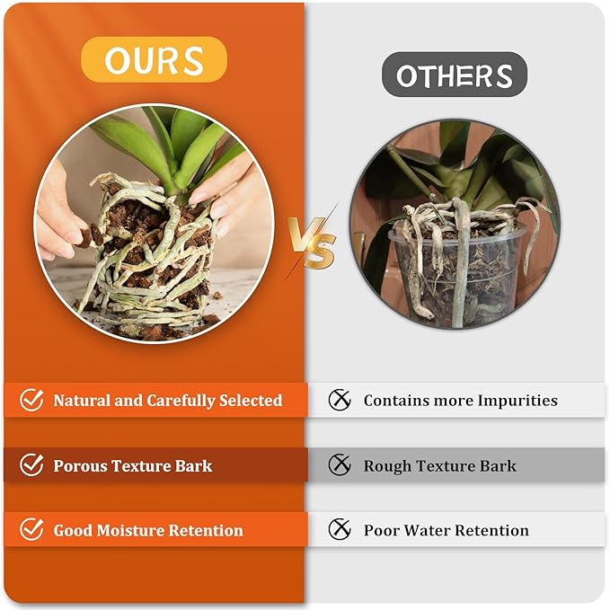 - Optimal Aeration and Drainage: This orchid bark potting mix is perfect for use alone as the bark for planting or repotted orchids, it keep the potting medium light and not compact, providing ample air circulation around the roots, drains excess water; It can be stored for a long time without rotting, avoiding the hassle of replacing the substrate every year