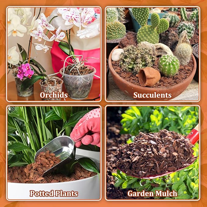 - Excellent Water Retention: Our orchid bark for plants greatly reduces water evaporation and increases water retention, so tropical potted plants require less watering; Pine bark can be used as a beautiful soil mulch to add visual consistency to your indoor potted garden, as well as a natural weeding mulch; Bark chips last longer than coconut coir or shavings and serves as a more permanent and effective growing medium for plants
