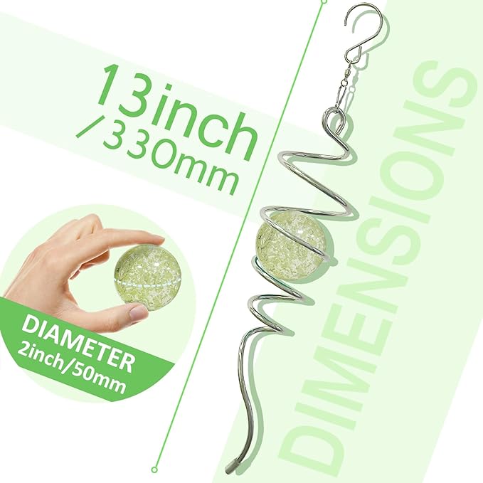 - 【EASY TO POSITION】:The Spiral can't spin by itself ,if you want to make it spin like the video ,need add 1pc motor (not include) ,or combine it with a wind spinner or any rotatable hanging ornament to help it rotate. Come with 1pc 2 inch colored glass orb(not paint), 1pc silver color spiral tail twister,and 1pc swivel hook accessory, ready to hang and enjoy.
