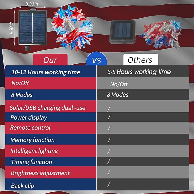 - 8 Lighting Modes with Memory Function: These Independence Day decorative string lights have 8 lighting modes for you to choose- combination, in waves, sequential, slogs, chasing/flash, slow fade, twinkle/flash, and steady on. Directly press the button on the solar panel to change the modes. Comes with memory function, after turning off the power, it will automatically remember the last setting, so it does not need to reset every day.
