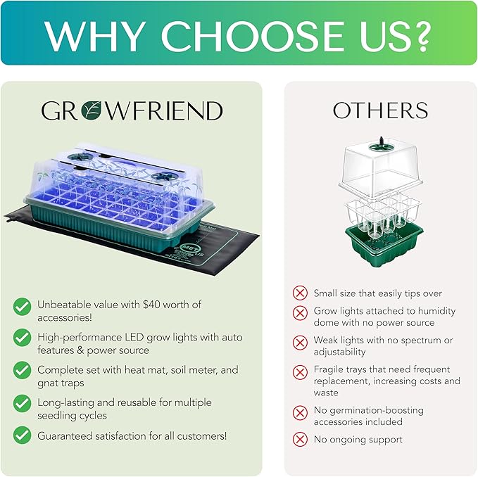 - [Complete Seed Starter Kit for Indoor Gardening] Start your gardening journey with our all-in-one seed starter kit, designed for successful seed germination and healthy seedlings. This premium kit includes a heavy-duty 40-cell seed starter tray with drainage holes, two LED grow lights to mimic natural sunlight, a 10"x20" seedling heat mat for ideal temperature control, a 3-in-1 moisture meter for accurate soil monitoring, sticky gnat traps to protect plants from pests, and a bonus gardening eBook with expert seed-starting tips. Perfect for growing herbs, vegetables, microgreens, and flowers indoors, this kit provides everything you need for strong and vibrant plants.