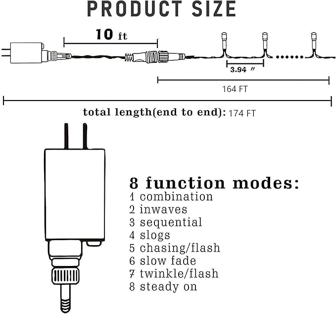 - Specification: Halloween 500 LED string lights, The outdoor lights has 10 FT leading wire, and the light string is 164 FT, total length is 174 FT, the bulb spacing is 3.94 inch.