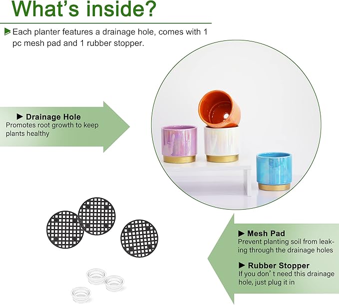 - Size & Package: Set of 4 - 4.0 Inch Pots for Plants Indoor. Package: contains 4 ceramic pots for indoor plants, 4pcs mesh pads, and 4pcs rubber stoppers (NOT INCLUDE PLANTS)