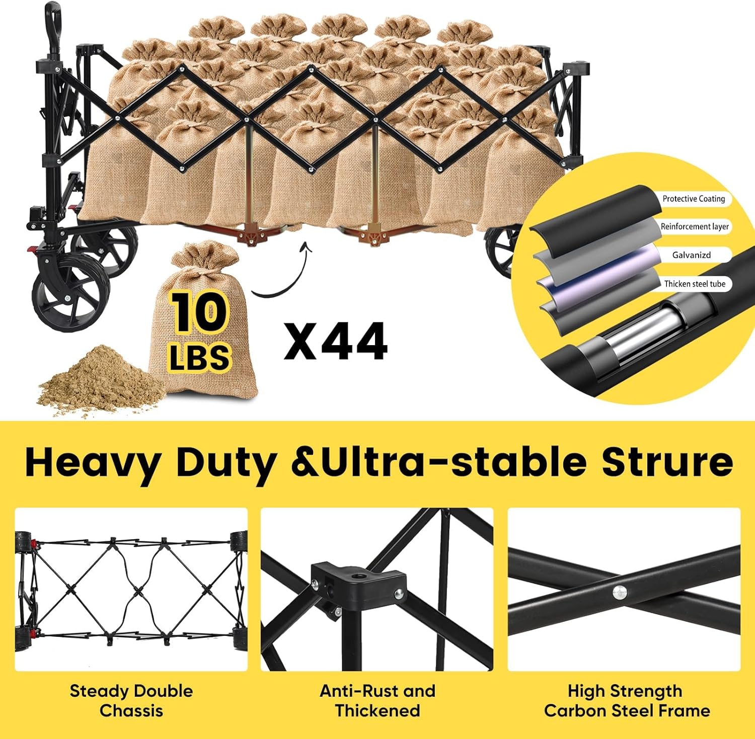- 【𝐔𝐥𝐭𝐫𝐚-𝐒𝐭𝐚𝐛𝐥𝐞 𝐒𝐭𝐫𝐮𝐜𝐭𝐮𝐫𝐞】:𝐏𝐚𝐭𝐞𝐧𝐭𝐞𝐝 frame structure, using pipes that are 𝟐𝟎% thicker than normal wagon, is more stable and secure than other push carts .loading capacity up to 𝟒𝟒𝟎𝐥𝐛𝐬.With Φ 𝟳" 𝐛𝐢𝐠 𝐚𝐥𝐥-𝐭𝐞𝐫𝐫𝐚𝐢𝐧 wheels and brakes,Sekey wagon can move smoothly for any occasion.