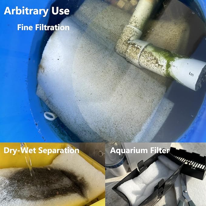 - 🐟Arbitrary cutting: Our pond filter pad can be easily cut to any size you need, saving more money; suitable for all sizes of filtration systems, such as koi pond filters, waterfall filtration, pond skimmer box, etc. 【The item is shipped in compressed packaging, the thickness will be thinner, after unpacking and leaving it for a period of time, the fiber will return to its original thickness.】