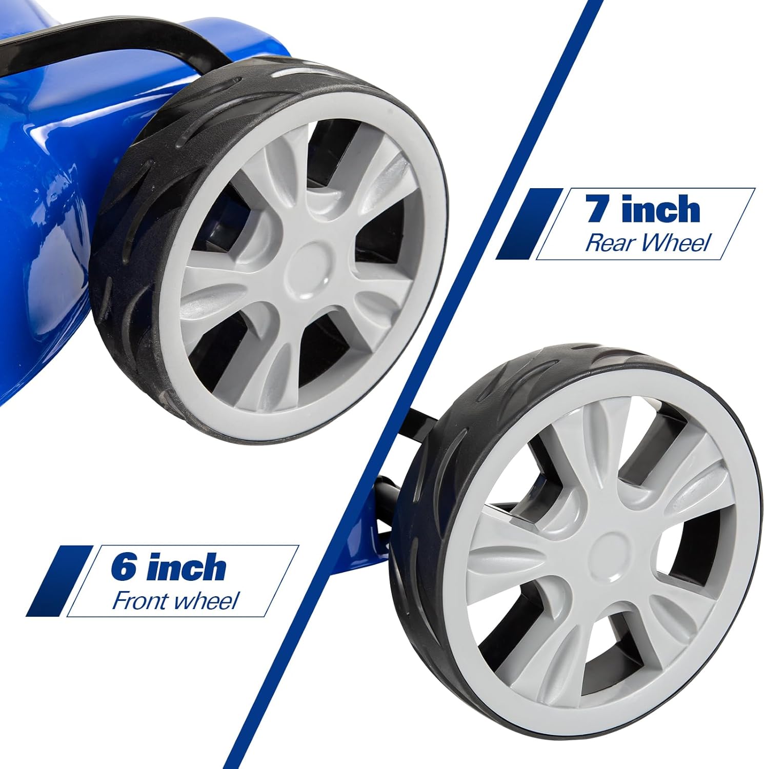 - Mowing Convenience - 7" rear/6“ front double ball-bearing wheels achieve smooth movement, comfortable foam-wrapped angled grip eliminates grasp fatigue.