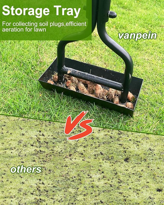 - ✅ [Storage Tray for Soil Cores] vanpein Patented Lawn Aerator Tool is designed with a storage tray for collecting soil cores. Compared to regular core aerator lawn tools, there are no traditional process of cleaning up soil plugs that are over the lawn. Simply clean out ejected plugs stored in the tray at regular intervals, saving more time and effort. Welded alloy tray is sturdy and durable for storage. Newly aerators make your lawn, garden, yard care easier.