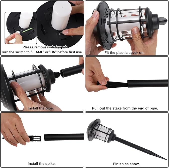 - FLICKERING FLAME TORCH LIGHTS: Connect the light, pole and stake(inside the pole), insert the stakes into the soft soil or ground where there has direct sunlight. Solar LED flickering flameless garden pathway lights, add a 360 degree viewing angle illuminate charming to your garden, decorate your fence, deck, porch or yard. Size with Stake- 4.9 x 4.9 x 17 inches