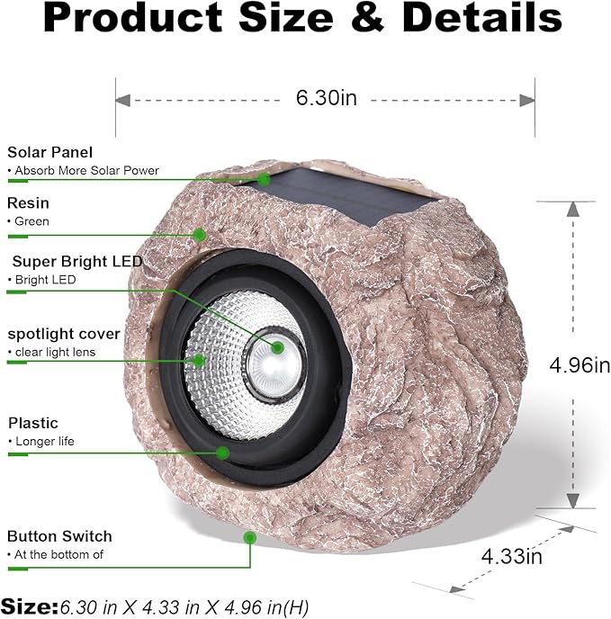 - ☀️🪨SOLAR POWERED ILLUMINATION: These decorative spotlights require no wiring and are powered by an integrated solar panel, providing eco-friendly lighting anywhere outdoors.