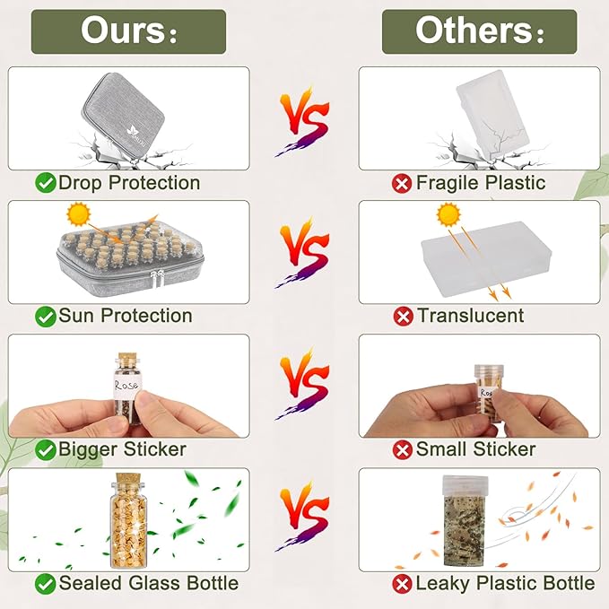 - [Upgraded Protection for Your Seed]: SMUJU seed storage organizer using a combination of small glass bottles with corks and wooden corks,which can ensure that the seeds are protected from water vapor and sunlight, preventing oxidation and spoilage of the seeds, thereby increasing the survival rate and germination rate of the seeds. Compared to other plastic bottle, SMUJU glass seed storage bottles are more sturdy and more sealed.(Seeds Not Included)
