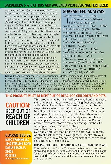 - 🍊 Promote vigorous growth and achieve bountiful yields in your citrus and avocado plants with Gardenera Citrus & Avocado Plant Food. Our carefully balanced 6-4-6 formula is specifically designed to provide the perfect combination of essential nutrients to support the optimal health and productivity of your plants.