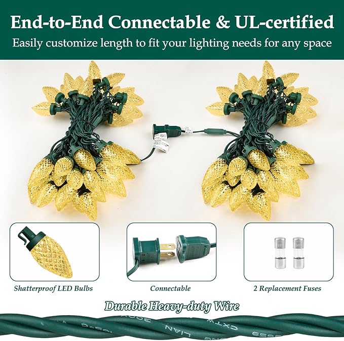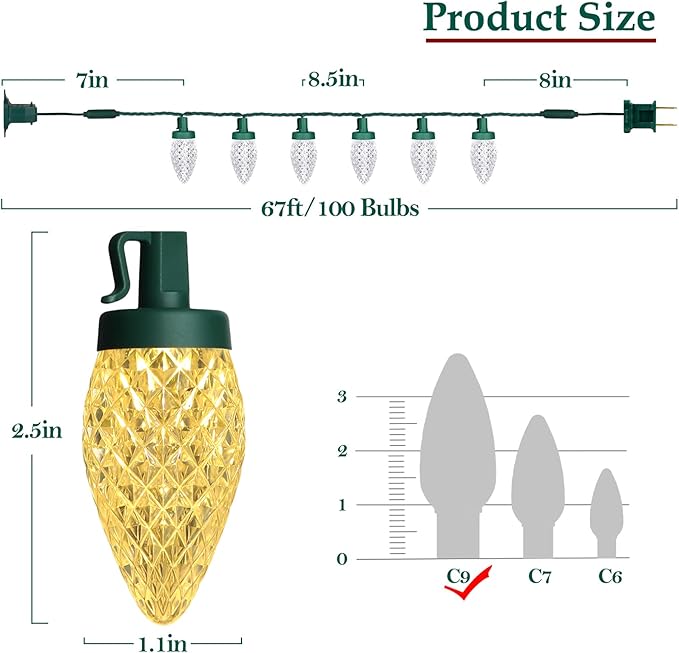 - 🍓【Shatterproof C9 Strawberry LED Bulbs】 Each strand of string lights is 67 feet long and equipped with 100 bright C9 strawberry-shaped LED bulbs. They are easy to use - just plug and unplug for ON and OFF - and long enough to wrap around a Christmas tree or anywhere else you'd like to add some light, such as your porch, garden, lawn, yard, or roof.