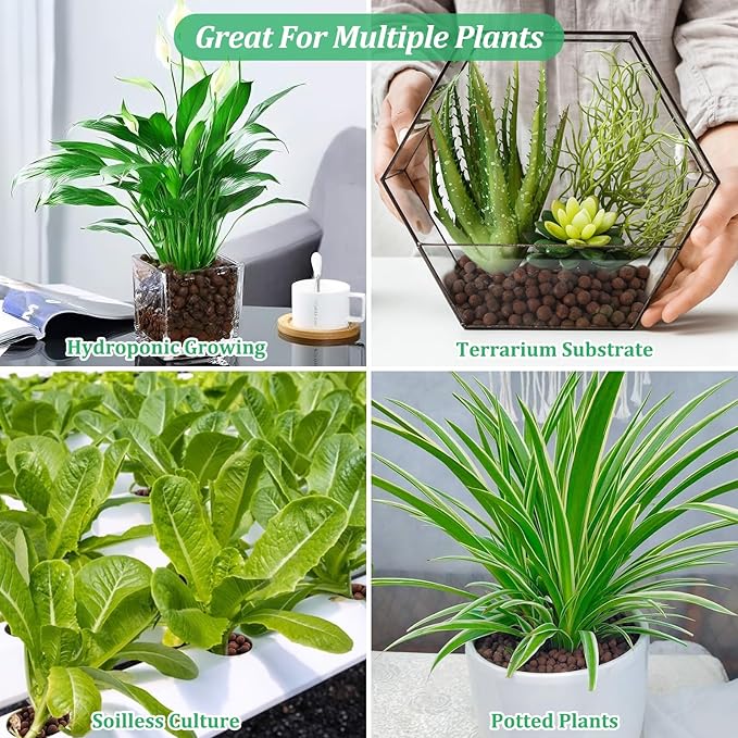 - Premium Grow Media: Clay aggregate which porous structure can absorb water and retain nutrients, and its good aeration provides the right amount of oxygen for your plants. Additionally, our light expanded clay can improve the potting environment and soil fertility, which increase the survival rate of plants and make them grow healthily