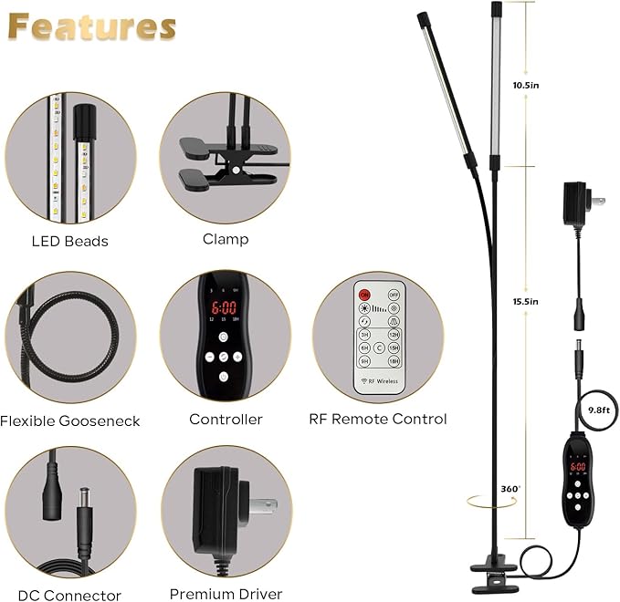 - 【Dual-Control Multi-Functionality】: With a line controller and an RF controller (designed for eye protection, minimizing direct light exposure), it supports 3 color mode, 10-level dimming, 3 independent light controls, and 6 timing presets. Equipped with a flexible gooseneck and robust clamp, this LED plant light lets you fine-tune the light's direction, optimizing indoor plant coverage. Moreover, a professional DC power plug is included to enhance LED power.