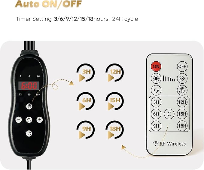 - 【Timer Setting】: This plant lamp offers 6 timing choices (3H/6H/9H/12H/15H/18H). Once you set the timer, it operates within a 24-hour cycle. For instance, if you choose 6 hours and keep the power on, the lamp will run for 6 hours out of every 24. This effectively handles the challenge of tending to plants during both workdays and vacations.