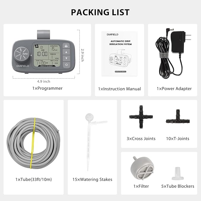 - Easy to Assemble: This water timer set including: Programmer x 1, 33ft tube x 1, power adapter x 1, Filter x 1, T-joints x 10, Cross-Joints x 3, Tube Blockers x 5, Watering Stakes x 15; You can DIY the watering plan yourself, which can cut the water pipes and design an exclusive irrigation system for your plants