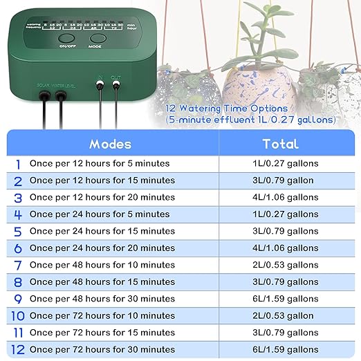 - 12 IRRIGATION MODES FOR YOUR CHOICE - Press the MODE button to achieve the timer function and select the different watering frequency. You can set to pump for 5/15/20 minutes pump time every 12 or 24 hrs, or 10/15/30 minutes pump time every 48 or 72 hrs. With 12 timing modes, you can easily customize the watering frequency to suit your plants' needs.